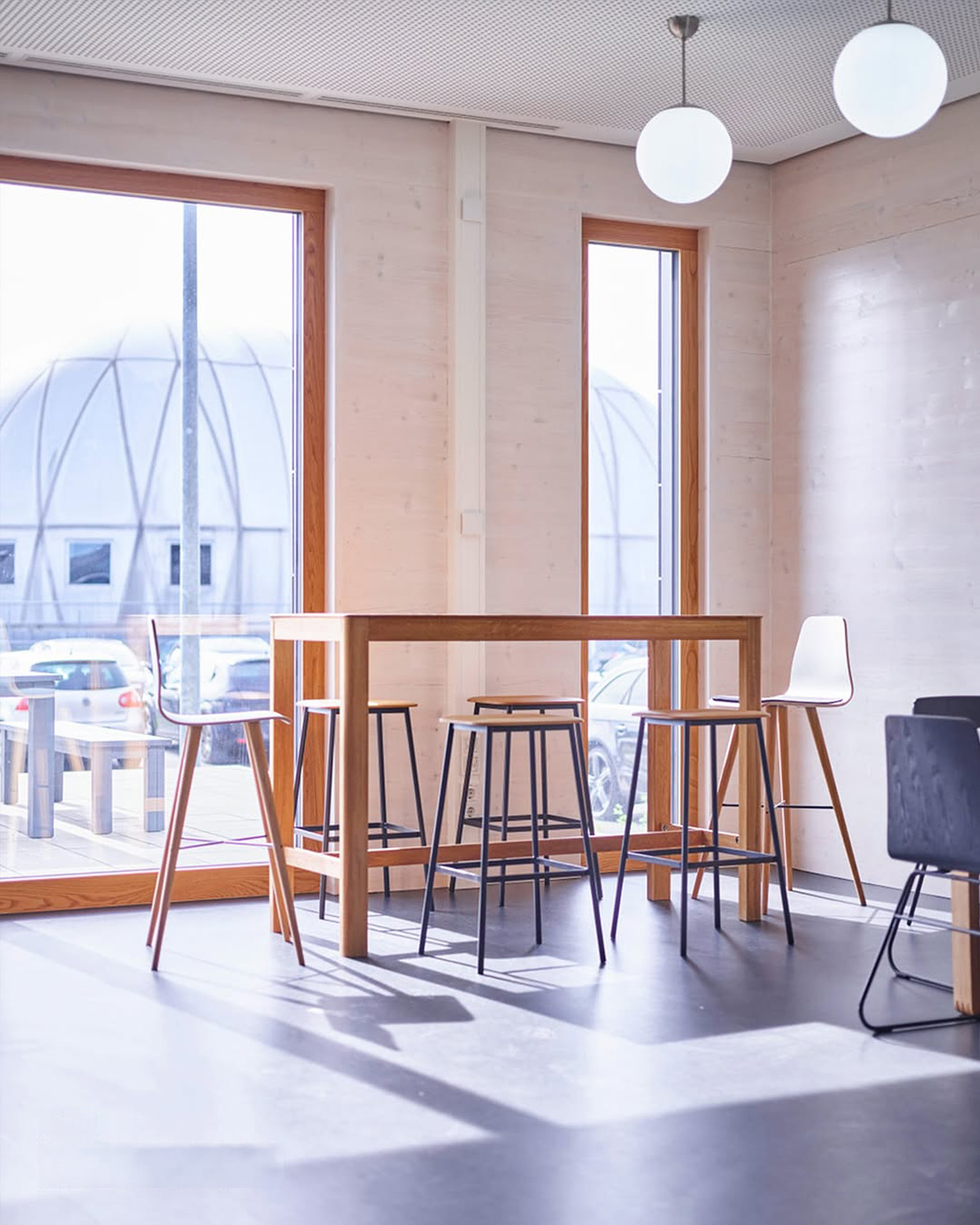 Es wurden langlebige Holz-Alu-Fenster mit großen Glasflächen und integriertem Sonnenschutz verbaut. Die klare Linienführung unterstreicht das moderne Design des Gebäudes, während technische Details wie Sicherheitsverglasung und Wärmeschutz auf dem neuesten Stand sind.